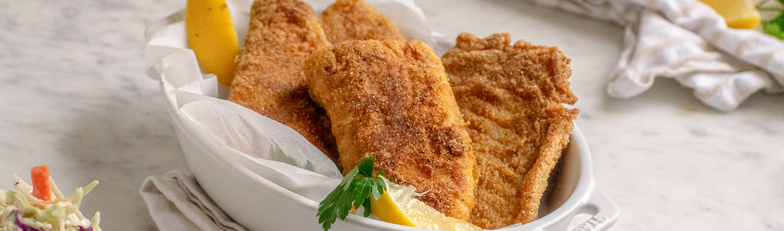 Cornmeal Fried Fish has a golden, flaky crust with a soft and delicate inside. Fry up some boneless fish fillets coated in cornmeal in just a few minutes for an amazing entrée option for lunch or dinner. This recipe pairs well with many foods like fries, fresh salad, coleslaw, and more.